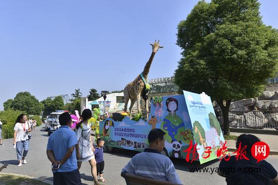 最后篇章的動物科普篇——動物之殤,向游客朋友們展示的是動物標本。其中最為特別的是身高3米多的長頸鹿標本。遠遠看去,一只高大的長頸鹿穩穩地站在花車上,不知情況的游客們都好奇,“怎么一動不動呢?”原來,前幾年,這只長頸鹿誤食了游客亂投喂的食物特別是塑料袋而導致了死亡。無錫動物園也非常不舍得丟棄它的尸體,便將其尸體制成了標本保存。這次參與巡游,也是動物們現身說法“愛我請不要投喂我,我們有自己的食物”、“我們都是食品塑料袋的受害者”、“保護地球、愛護環境”……壓軸的黑猩猩河童與飼養員一起騎著自行車,也在呼吁游客朋友們愛護動物。五大方陣中,還有可愛的卡通人偶、搞怪的小丑與小朋友現場互動哦。