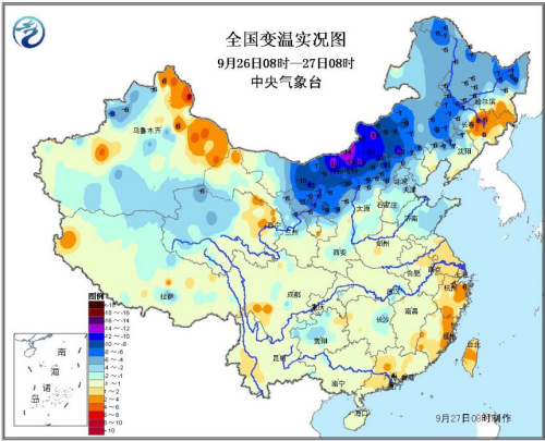 中央氣象臺今晨發布的消息稱,預計9月27日至29日,受冷空氣影響,中國中東部大部地區氣溫將自北向南下降4~6℃,其中,內蒙古東部偏南地區、東北地區中南部降溫幅度可達8~10℃。內蒙古中東部、東北地區南部、華北東部、黃淮東部等地的部分地區有5~6級風。