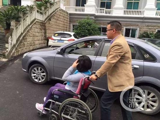 吳焱推著朵朵到紅花崗區人民法院參加庭審。(受訪者供圖)