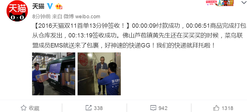 天貓2016年雙十一的第一單已經簽收!從下單,到簽收,僅僅用了13分鐘!