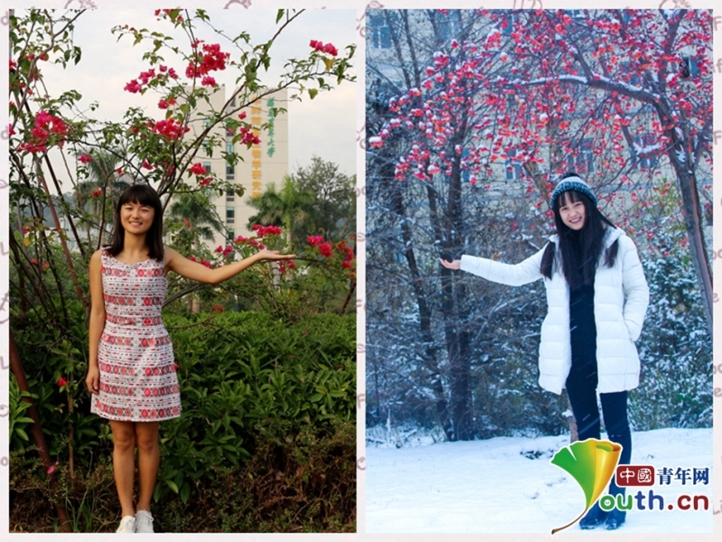 “我的南方的校園里四季如春,綠意盎然。”“我在北方的校園中大雪紛飛,滿樹銀花。”中國青年網(wǎng)通訊員 賴麗萍 楊坤 攝 中國青年網(wǎng)北京11月21日電(記者 崔寧寧 通訊員 賴麗萍劉倩)“南國春意濃,北國正冰封”。