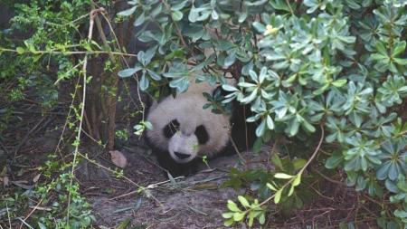 這只活潑的大熊貓叫“美奐”,是1個(gè)月前歸國的雙胞胎大熊貓中的妹妹,生性調(diào)皮好動。和它相比,姐姐“美輪”就害羞多了。一看到有生人來,“美輪”趕緊找個(gè)角落躲進(jìn)樹叢,把自己遮了個(gè)嚴(yán)嚴(yán)實(shí)實(shí)。