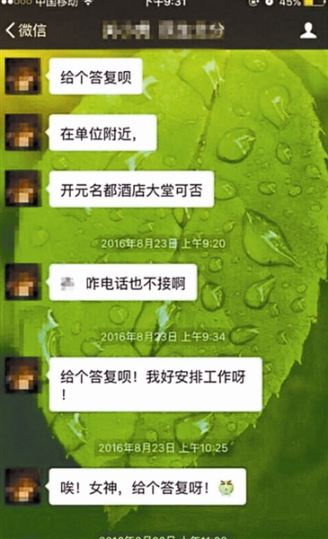 12月7日,隨著某微博賬號貼出多張王琪與涉事業務副總經理的聊天截圖,“某銀行北京分行的某個業務副總經理,利用職位來逼迫女生去開房”一事被曝光。截圖內容顯示,自今年8月17日至9月7日的半個多月時間里,業務副總經理曾向女職員王琪多次提出去某某酒店喝茶、同去酒店、私下約見面等要求,在王琪明確拒絕后,該業務副總經理又以“辭退”為由威脅王琪。