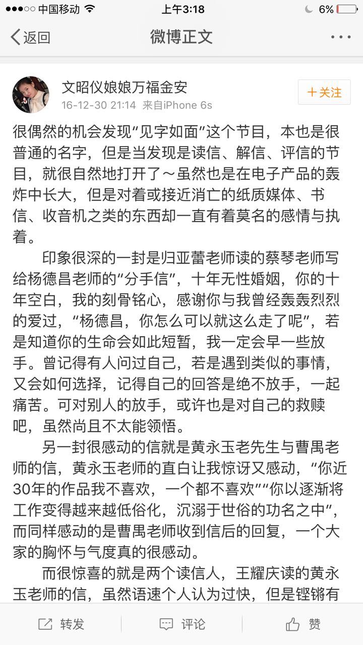“有質感”,“有內涵”,“錘擊內心”,“第一次看到這樣新穎的節目”,“絕對是2016年最后的驚喜”,“今年最值得傳播的節目”,“在2016年最好的、最有意義的一檔節目”……網友如此評價《見字如面》,并稱這是一檔能夠給人帶來靜謐的節目,“可以讓人思考、自修“,并讓人“突然覺得好像互聯網之外的中國是個不一樣的中國啊”。