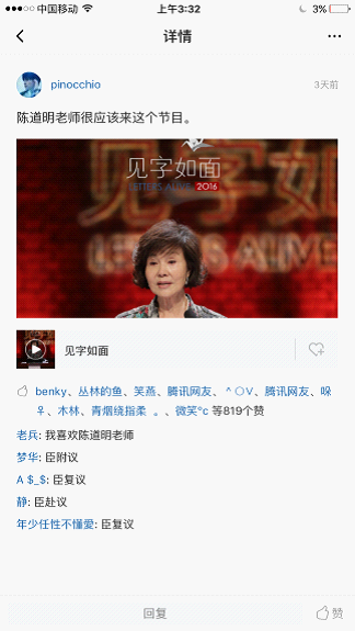 在《見字如面》熱播熱議的同時,推薦自己心目最適合這檔節目的藝人來當讀信人,成為網友們看完《見字如面》后又一個不約而同的群體性行為。目前陳道明、王凱、靳東、胡歌、祖峰等演員的呼聲最高。僅在騰訊視頻的一個評論下,已有819個人自動蓋樓呼吁陳道明前來讀信;還有很多網友點名胡歌朗讀《與妻書》……
