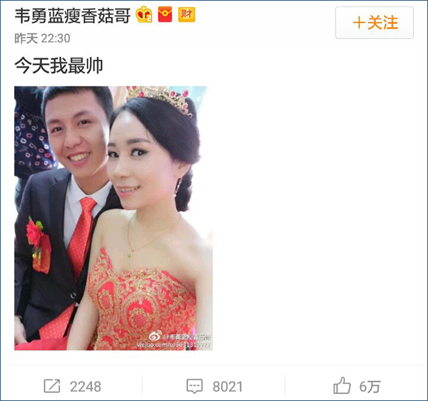 “藍瘦香菇哥”結婚了!