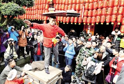 昨日,江津中山古鎮(zhèn)千米長宴現(xiàn)場,民間藝人大秀“頭頂傳菜”絕技。 本報記者 楊新宇 攝