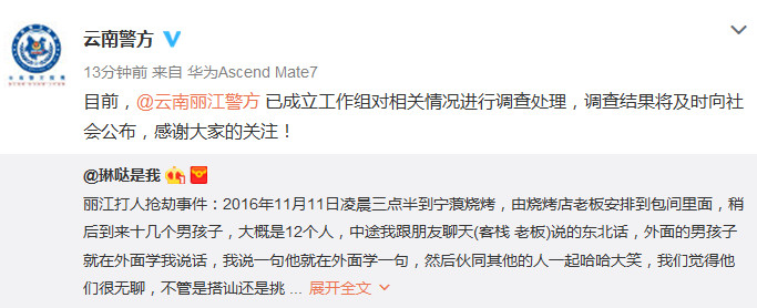 中新網(wǎng)1月25日電 24日,有網(wǎng)友發(fā)微博稱2016年11月在麗江旅游期間,被一群陌生人暴打。云南省公安廳官方微博今日轉(zhuǎn)發(fā)該網(wǎng)友微博并回應(yīng),稱麗江市公安局已成立工作組對(duì)相關(guān)情況進(jìn)行調(diào)查處理,調(diào)查結(jié)果將及時(shí)向社會(huì)公布。