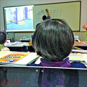 周琪坐在女兒后面,陪她一起在培訓機構上奧數課。