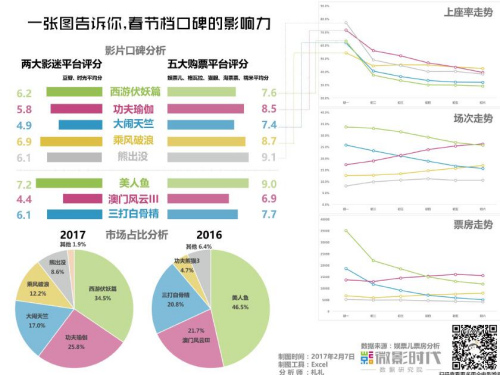 數據顯示,雖然今年春節檔總票房有升高,但是每天的票房都呈下滑趨勢,尤其是初一到初二,從單日8億大幅度滑落到5.8億,其中下跌最快的是《西游伏妖篇》和《大鬧天竺》,相對表現穩定的是《功夫瑜伽》,逆襲成功的是《乘風破浪》。