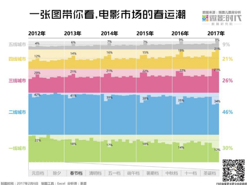 在中國人眼中,團圓是春節的符號,因此今年春節檔全國票房的區分也備受春運影響。微影數據研究院數據顯示,近5年來,一、二線城市春節檔票房明顯下降,四、五線城市呈上漲趨勢,三線城市比較穩定。