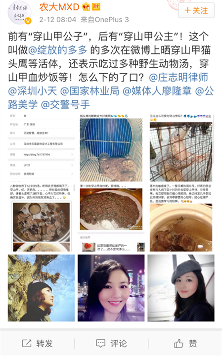 前有“穿山甲公子”,后有“穿山甲公主”!日前,一位網友曬出高官宴請吃穿山甲的圖片,引發網友強烈關注,部分網友稱其“穿山甲公子”。2月12日,微博認證為“湖南農業大學東方科技學院培訓與對外交流合作中心主任”的網友“農大MXD”曬出一位“穿山甲公主”,因其在微博上經常曬出食用穿山甲等野味,再度引發網友熱議。目前,廣東省林業廳已介入調查。