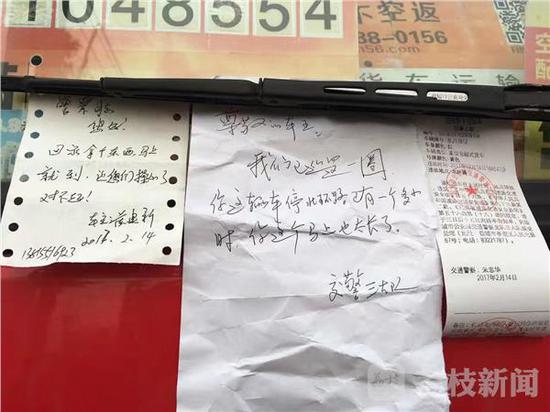 “貼了一張條說,警察同志,我回家拿一下東西,馬上就回來,敬請你原諒。”朱忠華告訴記者,“貨車停在小區門口,可能人家真有急事,人性化執法,我們就想算了吧,而且他馬上就走了,不妨礙交通就行了。”見著紙條上語氣誠懇,而說好“馬上就到”,交警就網開一面,和同事到別處巡邏。