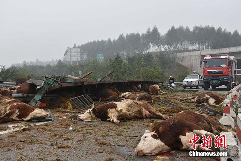 記者2月18日從重慶消防部門獲悉,當(dāng)天上午11時(shí)許,重慶豐都G50S高速路高家鎮(zhèn)下道口匝道上,一輛滿載48頭牛的大掛車側(cè)翻在匝道上,造成車內(nèi)2人受傷,車上多數(shù)活牛被摔翻在周圍。事故造成該下道口暫時(shí)封閉。豐都消防大隊(duì)指揮中心接警后迅速出動(dòng)前往現(xiàn)場(chǎng),經(jīng)過40分鐘的緊張救援,成功將被困人員救出。黃華 攝