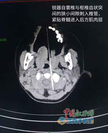 當班醫生于第一時間請來擅長治療上頸椎病的姚浩群副主任醫師會診。據姚主任根據CT平掃判斷,竹簽經寰椎與樞椎齒狀突之間的狹小間隙刺入椎管,緊貼脊髓進入后方肌肉層。“竹簽已經貫通椎管,并且所在的椎管正是呼吸、心跳等生命中樞所處的位置,因此如果進行這一位置的異物取出,孩子隨時可能有生命危險。”南昌大學第一附屬醫院姚浩群副主任醫師對王女士解釋道。