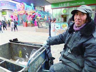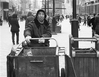 昨日下午1時許,記者在中街步行街見到正在收拾衛生的趙永久。工作服袖子已經裂口,一雙皮鞋破舊不堪。56歲的趙永久凍得流了鼻涕卻來不及擦一下,一個垃圾桶挨著一個垃圾桶往車上倒垃圾。