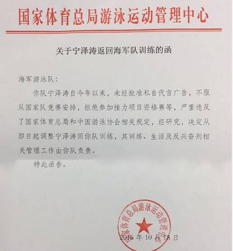 法制晚報訊(記者 徐邦印)今天上午,一份“關于寧澤濤返回海軍隊訓練的函”的文件曝光,文頭和落款蓋章為“國家體育總局游泳運動管理中心”,簽署日期為2016年10月18日。部分媒體指出這是寧澤濤被國家游泳隊開除的證據,《法制晚報》記者致電游泳中心辦公室,一位工作人員表示,“很多人在問這事,我們部門的角度,暫時不發表評論”,后記者多次撥打中國游泳隊領隊許琪電話證實此事,均未打通。