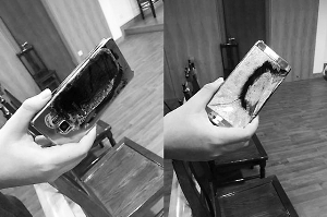 手機送到后,意外突然降臨。據姚某回憶,9月18日21時許,他拿著手機坐在家中床上玩游戲,手機突然震動,隨后手機屏幕發出“吱吱”的聲音,并冒出白色煙霧,姚某情急之中將手機扔在床上。接下來的一幕讓他更加恐慌:手機起火自燃,還散發出陣陣惡臭。事后,他發現,涼席、床單、席夢思床墊等均被燒出手機形狀的洞。