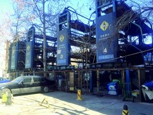 日前,記者來到工體南路小區(qū),劉先生所說的立體車庫就在工體南路小區(qū)門口的停車場內(nèi)最東側(cè),四個(gè)高度超過十幾米的立體車庫并排擺放,共占地上百平方米。每個(gè)車庫上有8個(gè)停車坪,可供32輛汽車停放。但目前這些立體車庫均成“空架”,外殼、鋼管都銹跡斑駁,內(nèi)部零件和設(shè)備凌亂散落。最低一層和周圍的地面上堆滿冰柜、舊家具、酒瓶紙箱等雜物,別說停放車輛,連落腳都難。車庫旁邊的兩三個(gè)簡易房還住著人,自稱從事貨運(yùn)配送工作,對(duì)立體車庫的情況一無所知,“我們來的時(shí)候這兒就已經(jīng)是這樣了,好多年了”。