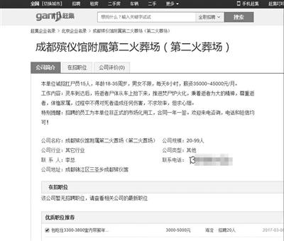 此外,在這些招聘廣告中,都沒有設(shè)置“學(xué)歷”、“年齡”、“語言”和“工作年限”的門檻,幾乎人人可以應(yīng)聘。更引人注目的是,該崗位均為高薪,月薪從1.5萬元至4.5萬元不等,甚至有“招聘者”標(biāo)注該崗位為年薪30萬元-31萬元。北青報(bào)記者注意到,類似的“扛尸員”招聘廣告出現(xiàn)在獵聘網(wǎng)、趕集網(wǎng)和中華英才網(wǎng)等多家招聘網(wǎng)站,涉及的地區(qū)則涵蓋上海、武漢和成都等多地。8日下午,北青報(bào)記者隨機(jī)撥打成都的“李總”和武漢的“石總”電話,詢問招聘情況,但兩人均表示自己并非“第二火葬場(chǎng)”負(fù)責(zé)人,也從未發(fā)布過“招聘扛尸員”的信息。
