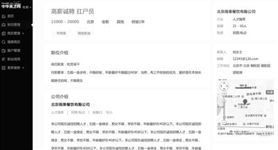 北青報(bào)記者以企業(yè)用戶身份,在中華英才網(wǎng)和趕集網(wǎng)上體驗(yàn)注冊(cè)及發(fā)布招聘信息流程。在中華英才網(wǎng)注冊(cè)過程中,北青報(bào)記者注意到,“公司名稱”為必填選項(xiàng)。此外,還要求填寫“公司行業(yè)”、“公司性質(zhì)”、“公司規(guī)模”和“公司地址”等信息,但并不需要提交營(yíng)業(yè)執(zhí)照等信息對(duì)企業(yè)用戶的身份進(jìn)行認(rèn)證。隨后,北青報(bào)記者隨意填寫了一家餐飲有限公司名稱、留下一個(gè)虛假電話,嘗試發(fā)布“扛尸員”招聘廣告。數(shù)分鐘后,該招聘信息發(fā)布成功。
