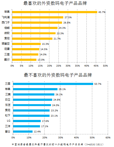 2017年的調(diào)查顯示,蘋(píng)果(Apple)是受訪(fǎng)者最?lèi)?ài)的外資數(shù)碼電子產(chǎn)品品牌,提及率為45.7%;其他外資數(shù)碼電子品牌的受歡迎度與蘋(píng)果相比只能相形見(jiàn)絀。具體而言,飛利浦以27.5%的提及率排名第二位,排名第三位的是西門(mén)子(26.8%)。佳能與微軟排位第四五位,提及率分別為24.3%和23.3%。