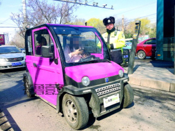 3月14日上午10點多,濟南歷下交警在趵突泉南路與濼源大街路口,對無牌無證三輪、四輪車展開集中查處。一輛粉色封閉式四輪電動車,沿著濼源大街由西向東行駛,行駛到路口的時候被交警攔下。這輛四輪電動車與大街上常見的老年代步車差不多樣子,沒有掛牌,車頭寫著“永源電動車”幾個字。駕車的是一名年輕女士,后排座位上乘坐的是一名中年女士。