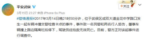 中新網(wǎng)3月16日電 據(jù)成都市公安局武侯區(qū)分局官方微博消息,2017年3月14日晚21時(shí)50分許,四川成都武侯區(qū)成雙大道金花中學(xué)路口發(fā)生一起車輛沖撞交警檢查卡點(diǎn)的事件,事件致一名民警和兩名行人受傷,肇事車輛撞上路邊隔離欄后停下,駕駛員經(jīng)搶救無效死亡。