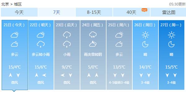 上周的北京暖意融融,春天似乎已經近在咫尺,然而昨日的一場冷雨,打亂了北京進入氣象意義上春天的步伐。根據未來7天天氣預報,北京本周仍以多云到陰為主,周三、周四、周五或還有降水天氣過程,其中周五的最高氣溫或降至5℃,最低氣溫則有可能被打回0℃,寒意明顯。