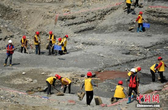 在媒體獲準進入區域的左側前方5米左右,20多名考古人員正在深溝里進行作業。據參與考古的相關人員介紹,本次出土的文物,大部分都集中在沙石底部的基巖上。