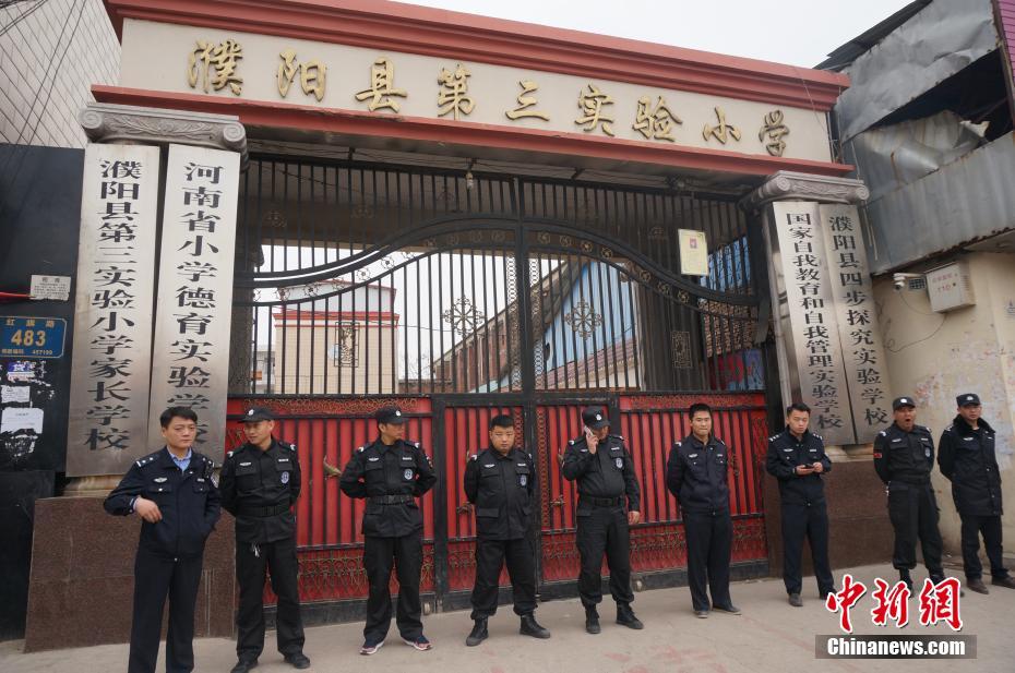 3月22日,河南濮陽縣第三實(shí)驗(yàn)小學(xué)老校區(qū)發(fā)生學(xué)生踩踏事故,官方通報(bào)稱,截至15時(shí),事故共造成22名學(xué)生受傷,其中一人送醫(yī)途中死亡,5人重傷,傷者正在醫(yī)院救治。記者當(dāng)天下午三點(diǎn)到達(dá)事發(fā)學(xué)校,了解到事故原因是:該校當(dāng)天舉行全校月考,學(xué)生在早上8點(diǎn)半考試前大量集中上廁所,在從二樓下到一樓時(shí)有學(xué)生跌倒,發(fā)生踩踏。圖為事故發(fā)生后學(xué)校已經(jīng)停課,武警在校門口戒嚴(yán)。 韓章云 攝