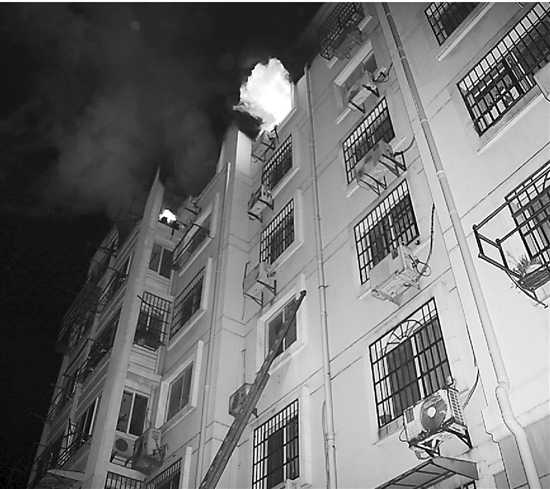 不到半分鐘,火勢猛烈燃燒,已蔓延到北面的小臥室。一名長頭發姑娘也爬出了6樓窗臺,她同樣緊緊攀在窗臺邊上。