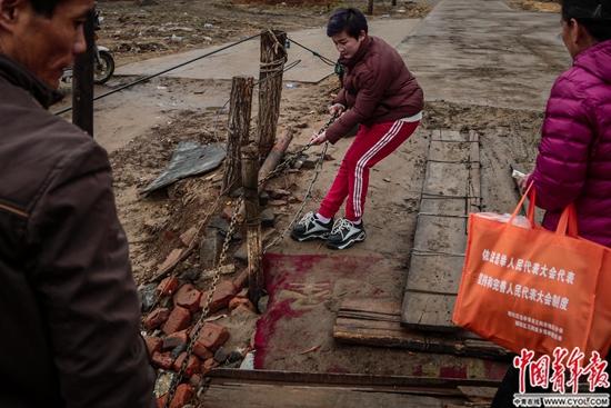 河北省香河縣王店子村,第四代擺渡人李國新的女兒幫渡船靠岸。