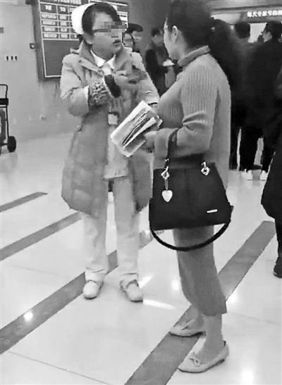 駱護士:我返回總臺工作大概20分鐘后,又有一個患者找到我說“你們醫院樓上有醫托”,當時我的火就上來了。這醫托就是在跟我們玩捉迷藏,我前腳剛走她又上來騙人,我氣的都語無倫次了。我到了二樓又看到那個穿綠色毛衣的醫托在掛號的窗口特別熱情地跟人搭訕,我上去就抓住了她,同時又給保安打了電話。后來就是視頻里的那些了,保安來了就把那人帶走了。