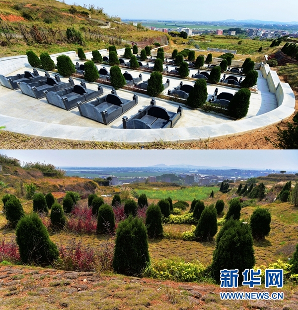拼版照片:上圖為福建省福清市?阪偝抗獯逡惶幷嫉500多平方米、有26個墓穴的違章修建的豪華墓群,其中23個墓穴是活人墓(2016年3月25日攝);下圖為同一處地點上的墓穴已經被拆除或遷出,墓穴上覆蓋著黃土和樹木(2017年4月1日攝)。新華社記者 魏培全 攝
