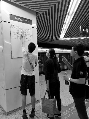 在地鐵惠新西街南口站下車(chē)后,記者看到方形的柱子一側(cè)張貼著的“北京城市軌道交通線網(wǎng)圖”標(biāo)牌,圖中站名都是小號(hào)字體。記者身高一米六出頭,但頭頂距離線路圖最底端仍有一段距離。
