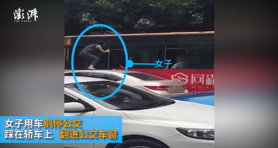 6月23日,四川成都,郫都區醫院門口,一女子壓線超車與公交車司機發生爭執,隨后女子用車別停公交車,從車頂爬進公交車窗,掌摑公交司機。