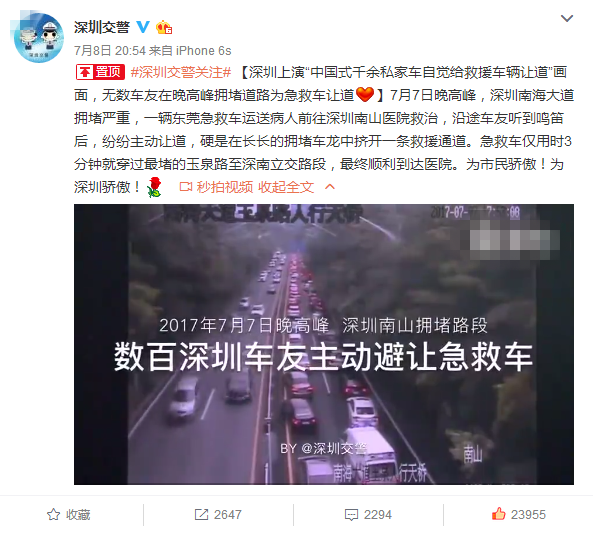 新浪微博@深圳交警發(fā)布現(xiàn)場(chǎng)監(jiān)控視頻。能夠看出,擁堵長(zhǎng)龍上的私家車(chē)司機(jī)在急救車(chē)到來(lái)之前不約而同地向兩邊行駛,合力讓出了一條暢通無(wú)阻的生命之路。