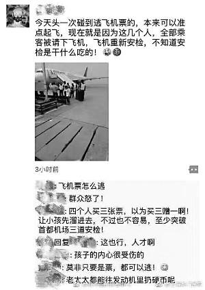 針對此事,中國政法大學航空與空間法研究中心研究員、北京市航空法學會常務副會長兼秘書長張起淮指出,航班上乘客逃票事件非常罕見,該行為直接危及航空安全,可以說性質(zhì)非常惡劣了。“根據(jù)《中國民用航空旅客、行李國內(nèi)運輸規(guī)則》的規(guī)定,已滿2周歲未滿12周歲的兒童,需按同一航班成人普通票價的50%付費,由航空公司提供座位。雖然逃票問題在各行各業(yè)都會有,不過一般逃票行為是違反了相關法律規(guī)定和行業(yè)規(guī)定,主要是危及自身安全,擾亂公共秩序。但逃機票就不一樣了,因為當事人私闖禁區(qū),躲避安全檢查擅自登機,會造成嚴重后果。如果逃票人并非僅是為了逃避購票費用,而在主觀上存在破壞民用航空器和飛行安全的故意,則很可能造成機毀人亡的慘劇。因此,對這個事情應該零容忍。”
