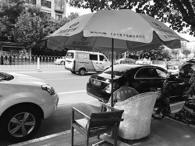 順著停車帶往東走,會看到身穿橙色制服的幾名男子騎著電動自行車來回巡視,每當有車從停車位開走,或者準備停車時,他們就會上前,從車的前擋風玻璃取下小紙條,按上面的時間收錢。在這條路中段的人行道上,立著一把黃色的大傘,傘下面擺著兩把椅子,一名身穿淺藍色上衣的男子正在路邊喝水,所穿的衣服后背上印著“停車管理”四個字。他告訴記者:“這條路兩側路邊停車都是要收費的,第一個小時6元,第二個小時9元。”他說因同村的老鄉有事,所以臨時來替他上幾天班。他指了指頭頂的遮陽傘說,這把傘和沙發都是路邊一家金融公司提供的。