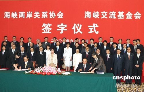 6月13日上午,海峽兩岸關系協會會長陳云林與臺灣海峽交流基金會董事長江丙坤在北京釣魚臺五號樓簽署“兩岸周末包機”和“大陸居民赴臺旅游”協議 。 中新社發 任晨鳴 攝
