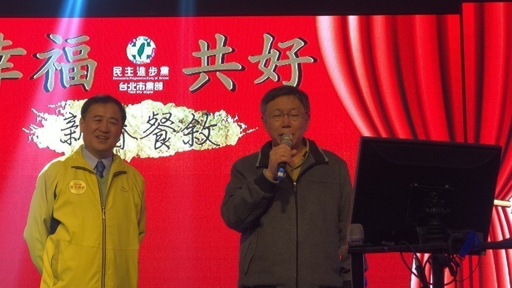 臺北市長柯文哲(右)25日在民進黨市黨部春酒上獻唱《挪威的森林》。(臺媒圖)