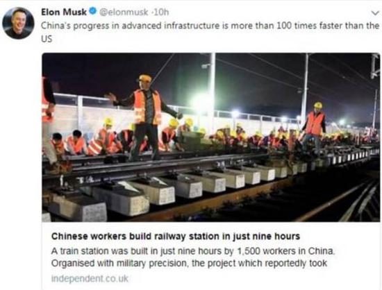 近年來,中國速度日益引發外媒關注。28日,一段中國工人在火車站施工的視頻又走紅美國,剛剛將跑車送上太空的企業家馬斯克(Elon Musk)也忍不住轉發贊嘆,“中國先進基礎設施發展速度比美國快了100多倍”。截至發稿,這條推文獲得7千多轉發,3萬點贊,外國網民也展開討論,為中國速度點贊。(央廣網)