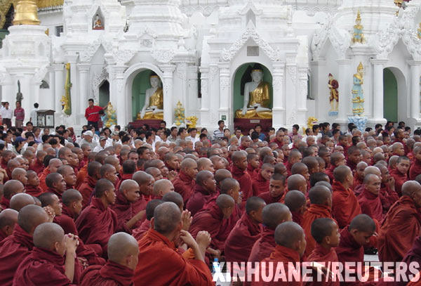 9月24日,在緬甸的仰光,僧侶們參加示威游行。緬甸仰光市數(shù)萬(wàn)名僧侶和市民當(dāng)天走上街頭,舉行近期最大規(guī)模的示威游行。此次示威是自18日以來(lái),仰光僧侶游行的最新升級(jí)行動(dòng),也是市民首次較大規(guī)模參與的示威游行。游行的標(biāo)語(yǔ)口號(hào)是:改善民生、釋放政治犯、實(shí)現(xiàn)民族和解等。 新華社/路透