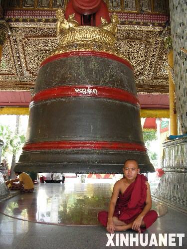 10月20日,僧侶坐在緬甸著名的仰光大金塔內(nèi)的大鐘前。 緬甸警方證實(shí),緬甸已經(jīng)取消仰光和曼德勒兩市自9月25日開始實(shí)行的宵禁。 新華社記者 張?jiān)骑w 攝