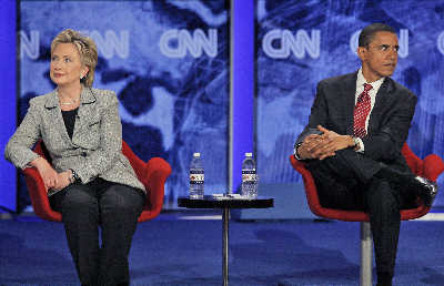 民主黨總統候選人希拉里(左)和奧巴馬在辯論會上(右)交鋒。IC圖