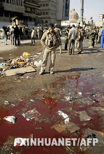2月1日,伊拉克警察和士兵在首都巴格達市中心的爆炸現(xiàn)場檢查。
