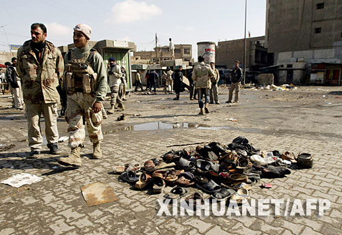 2月1日,在伊拉克首都巴格達市中心的一處爆炸現(xiàn)場,散落的鞋子被堆放在一起。新華社/法新