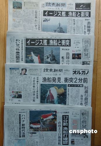 圖為19日至21日的合計發行量近2000萬份的《讀賣新聞》和《朝日新聞》的頭版頭條報道。2月19日發生的日本宙斯盾軍艦撞沉漁船的事故在日本政界引發了軒然大波,在野黨紛紛質疑擁有“世界上最先進的雷達系統”的軍艦為何突然不靈了,而首相福田則可能因此再次遭受新的打擊。 中新社發 段躍中 攝