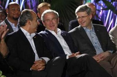 21日,美國總統布什(中)與墨西哥總統卡爾德隆(左)和加拿大總理哈珀(右)在北美峰會上。